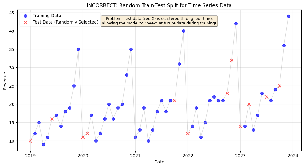 # create a chart that shows incorrect train test split by including future data in the training setimport numpy as np# set random seed for reproducibilitynp.random.seed(42)# create a copy of the residual values dataincorrect_split_df = residual_values.copy().reset_index()# randomly select 20% of the data as test set (INCORRECT for time series!)test_size =int(len(incorrect_split_df) *0.2)test_indices = np.random.choice(incorrect_split_df.index, size=test_size, replace=False)# create train/test labelsincorrect_split_df['split'] ='Train'incorrect_split_df.loc[test_indices, 'split'] ='Test'# plot the incorrect splitplt.figure(figsize=(12, 6))# plot train datatrain_data = incorrect_split_df[incorrect_split_df['split'] =='Train']plt.scatter(train_data['Date'], train_data['Revenue'], color='blue', label='Training Data', alpha=0.7, s=50)# plot test datatest_data = incorrect_split_df[incorrect_split_df['split'] =='Test']plt.scatter(test_data['Date'], test_data['Revenue'], color='red', label='Test Data (Randomly Selected)', alpha=0.7, s=50, marker='x')# connect all points with a line to show the time seriesplt.plot(incorrect_split_df['Date'], incorrect_split_df['Revenue'], color='gray', alpha=0.3, linewidth=1, zorder=0)# chart formattingplt.xlabel("Date")plt.ylabel("Revenue")plt.title("INCORRECT: Random Train-Test Split for Time Series Data")plt.legend()plt.grid(True, alpha=0.3)# add annotation explaining the problemplt.text(0.5, 0.95, 'Problem: Test data (red X) is scattered throughout time,\nallowing the model to "peek" at future data during training!', transform=plt.gca().transAxes, bbox=dict(boxstyle='round', facecolor='wheat', alpha=0.5), verticalalignment='top', horizontalalignment='center', fontsize=9)# save the plot# plt.savefig("chart7.png", dpi = 300, bbox_inches = "tight")