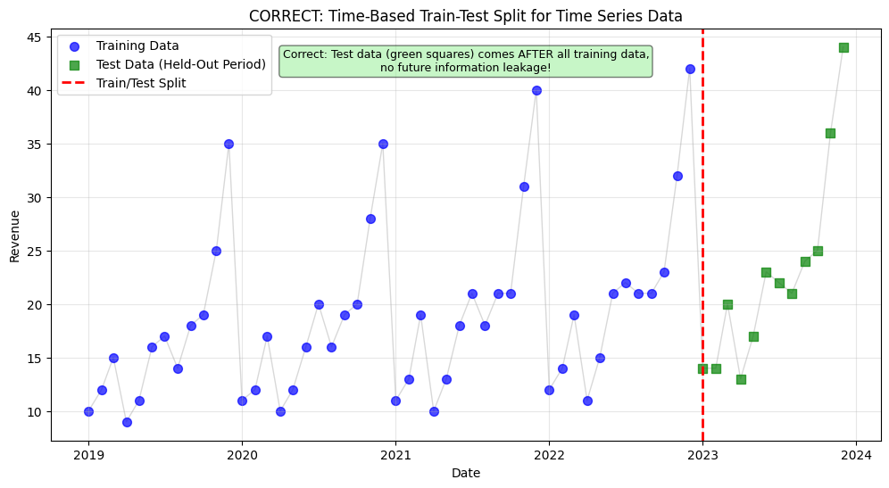 # now create a chart showing the CORRECT time-based splitcorrect_split_df = residual_values.copy().reset_index()# split by time: last 20% for testing (CORRECT for time series!)split_point =int(len(correct_split_df) *0.8)correct_split_df['split'] ='Train'correct_split_df.loc[split_point:, 'split'] ='Test'# plot the correct splitplt.figure(figsize=(12, 6))# plot train datatrain_data = correct_split_df[correct_split_df['split'] =='Train']plt.scatter(train_data['Date'], train_data['Revenue'], color='blue', label='Training Data', alpha=0.7, s=50)# plot test datatest_data = correct_split_df[correct_split_df['split'] =='Test']plt.scatter(test_data['Date'], test_data['Revenue'], color='green', label='Test Data (Held-Out Period)', alpha=0.7, s=50, marker='s')# connect all points with a lineplt.plot(correct_split_df['Date'], correct_split_df['Revenue'], color='gray', alpha=0.3, linewidth=1, zorder=0)# add vertical line at the split pointplt.axvline(x=correct_split_df.loc[split_point, 'Date'], color='red', linestyle='--', linewidth=2, label='Train/Test Split')# chart formattingplt.xlabel("Date")plt.ylabel("Revenue")plt.title("CORRECT: Time-Based Train-Test Split for Time Series Data")plt.legend()plt.grid(True, alpha=0.3)# add annotation explaining why this is correctplt.text(0.5, 0.95, 'Correct: Test data (green squares) comes AFTER all training data,\nno future information leakage!', transform=plt.gca().transAxes, bbox=dict(boxstyle='round', facecolor='lightgreen', alpha=0.5), verticalalignment='top', horizontalalignment='center', fontsize=9)# save the plot# plt.savefig("chart8.png", dpi = 300, bbox_inches = "tight")